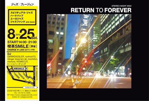 【RETURN TO FOREVER Vol.2】 ■ 2012/8/25(sat) 14:00〜21:00 ¥1500 (2ドリンク付き) ■ DJs: @DiRRKDiGGLER,@norinori70,@Ginger does'em all,@mochilon,@moriura(ex.quinta_mind) ■GUEST DJs: @トーニャハーディング @HOMECUT ■place:喫茶SMiLE →…